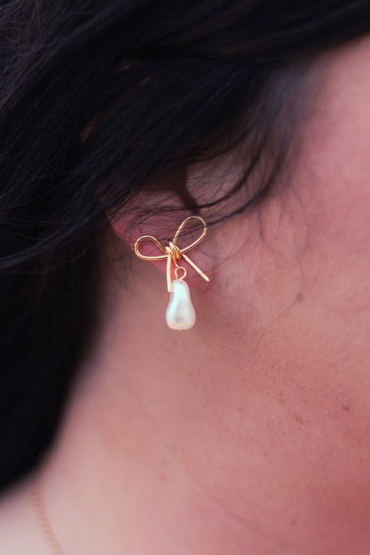 Sold outPearl Dangle Gold Bow Drop Earrings