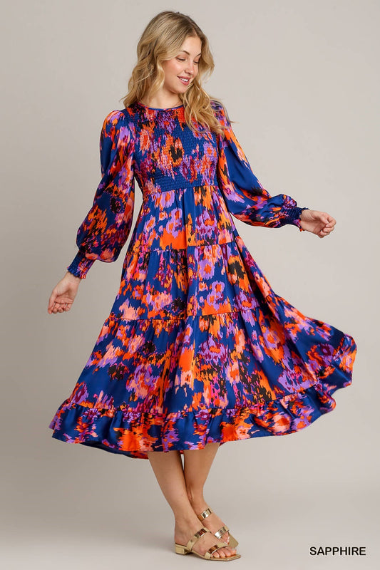 Satin Smocked Printed Long Sleeve Tiered Dress